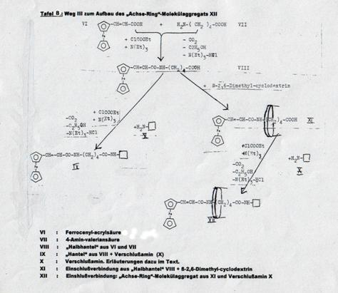 II Axis-ring molecular agggregates The author explored the question of axis-ring molecular aggregates outlined in Fig.2 in a series of lectures, round-table talks and discussions from 1943 on [overview in references (9, 10)] and pointed out ways of synthesizing such "compounds". In personal talks, Profs Richard Kuhn and Lüttringhaus encouraged him to realize projects like the one stated, i.e. (9g,1) II.1 Recovery and analytical chemistry Four pathsways were taken to synthesize such molecular aggregates in 1953 - 58, as shown in Pl 7 - 10. It proved possible to realize three of the four desired end products (Pl 2), viz the aggregates XIX, XII and XXIV; it was not possible to obtain aggregate V (Pl 10): Pathway I. The type-II molecular aggregates synthesized (Fig 2) were: XIX: Dipeptide from trans-cinnamic acid, δ-amino-valeric acid and naphthylamine, ringed with cyclodextrin (Pl 7): Pathway II XII: Dipeptide from ferrocenyl acrylic acid, δ-amino-valeric acid and closing amine, ringed with cyclodextrin (Pl 8): Pathway III XXIV: Dipeptide from cyclopentadienyl-manganese-tricarbonyl-acrylic acid, δ-amino-valeric acid und closing amine, ringed with cyclodextrin (Pl 9): Pathway IV The elucidation of the iodine colour reaction and inclusion compounds by F Cramer et al [Ber dtsch chem Ges 83 296 (1950), 86 1576, 1582 (1953)] in the 50s suggested considering cylodextrins as ring systems – in fact, as our own experiments showed - above all the β-2,6- and γ-2,6-dimethyl-cyclodextrins (12, 14, 11). The pathway first taken (Pl 10), using diallyl glycolether as the axis and closing it by reaction with hexachlorocyclopentadiene, forming hexachlorobicycloheptene systems (15), did lead to stringing a cyclodextrin ring together to the "semi-dumbbell" IV (Pl 10) but not to the end product desired: "dumbbell" V, as the reaction temperature required for adding the second hexachlorocyclopentadiene molecule caused decomplexation. The pathways II–IV presented in Pl 7 - 9 were positive, where peptide closed on one side was ringed and then closed with a differently structured component to become a "cyclodextrin-dipeptide dumbbell". Plate 7: Synthesizing the axis-ring molecular aggregate XIX: Pathway II
