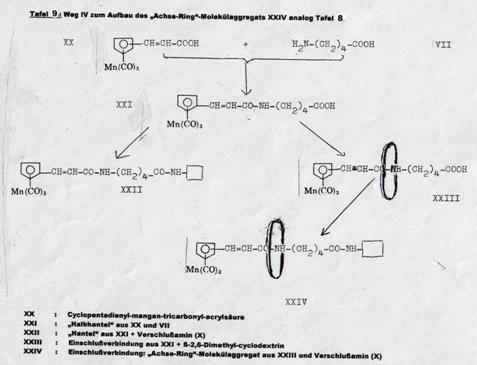 Key to Pl 7 - 9: Reaction of "semi-dumbbell" compound XV with β-2,6-dimethyl-cyclodextrin to XVIII [type I compound] (Fig 2): A suspension of 0.01 mol XV (Pl 7) in 75 ml tetrahydrofuran (THF) is treated with agitation with 0.01 mol β-2,6-dimethyl-cyclo-dextrin. Product XVIII obtained the next day after destilling off the solvent in vacuo is dried at 40oC. C70H115O38N (XV : cyclodextrin = 1:1) C calc 59.7% found 60.0% H calc 7.29% found 7.1% N calc 0.9% found 0.8% TLC: Rt value of XVIII at 0.15; of cyclodextrin: 0.63. - Merck TLC-plates IR: 1712 (C=O), 1650, 1528 amide bands; 1609: (C=C) 3280 - 3550: OH bands of β-2,6-dimethyl-cyclodextrin according to labreports; synthesis of XV described in (13) Synthesizing the"axis-ring" molecular aggregate XIX (Pl 7) [working with 0.001 mol quantities (1:1:1:1)]: ClCOOC2H5 is laced into the solution of XVIII from the above experiment and triethylamine in 100 ml THF at -20oC and caused to react after several hours of agitation with β-naphthylamine (or other bulky amines). After 48 hrs of agitation, processed to XIX by destilling off the solvent in vacuo and treating the residue with diethylether. C80H123O37N2 (XVIII : cyclodextrin = 1:1) C calc 56.3% found 56.0% H calc 7.2% found 7.4% N calc 1.6% found 1.5% TLC: Rt value of XIX 0.0; of cylodextrin: 0.62 IR: Amide bands 1655, 1532 Elimination of β-dimethyl-cyclodextrin from compounds XVIII and XIX by the action of amyloglucosidase: XVIII and XIX are treated with amyloglucosidase at 40oC in an incubator and processed after 48 hrs by adding water, destilling off, washing and drying in vacuo. The IR spectra of the reaction products obtained from XVIII and XIX indicates the lack of the cyclodextrin component. Plate 10: Synthesizing the “axis-ring” molecular aggregate V: Pathway I