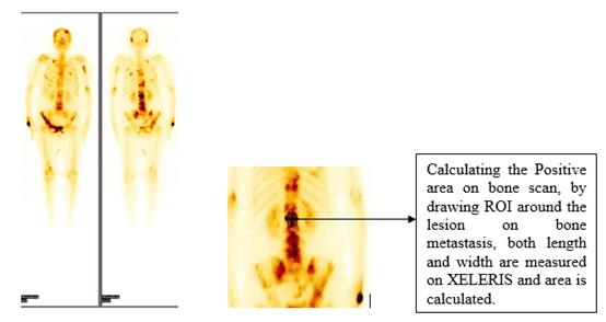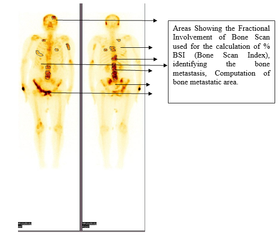Prostate Cancer is one of the common cancers in the world. It could primarily disseminate to the bone and can lead to death. In order to address its life threatening distant metastasis it is important to diagnose it earlier for timely treatment. Bone metastasis is usually diagnosed deploying bone scan imaging. However interpretation of the bone scans is a tedious procedure for the physicians and often leads to misinterpretation either as overestimation or underestimation of the metastasis. To minimize the risk of misinterpretation, one of the accurate methods is quantitative analysis of the bone scans in order to ascertain, whether a metastatic lesion is present or not. There are several methods to-date which can be used to analyse the extent of such lesions. For example, quantitation of the bone scan using quantitation methods i-e % BSI (Bone scan index), % PAB (Positive area on bone scans), EOD (extent of disease) and BLS (Bone lesion scoring). These methods are used for prognostication of survival and response to treatment on serial scans. The extent of fidelity of these all available quantitatation methods is not clear when used altogether in a single baseline bone scan. Therefore, the aim of this study is to use all available bone scan quantitative parameters on a baseline bone scans and to compare them all. Moreover, an improved methodology is introduced by comparing the results with the individual methods reported in literature and with PSA levels.
