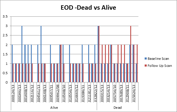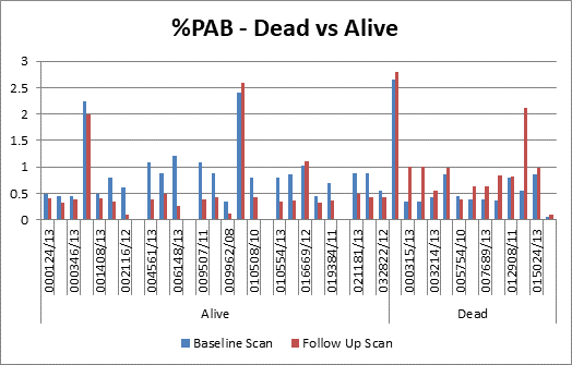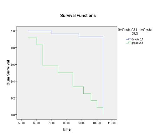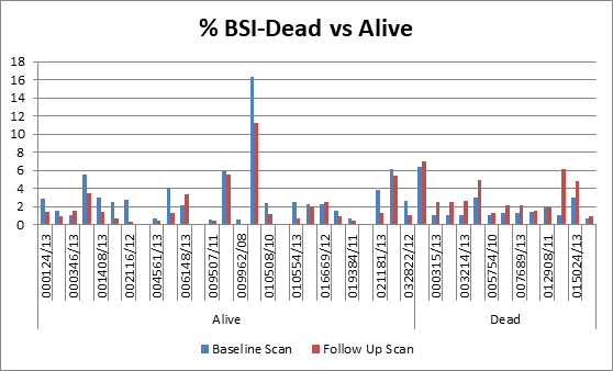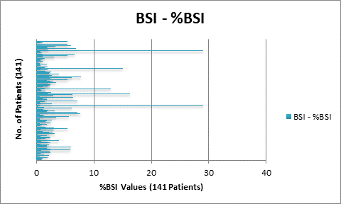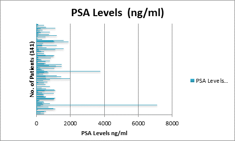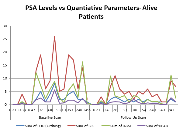 141 patients with histopathologically proved prostate cancer were chosen to implement all the four quantitative parameters on individual baseline bone scans. After which, for the calculation of risk of progression or regression of disease and survival rate, 40 patients were chosen from the same dataset. A serial follow up scan was performed to calculate 2-years survival rate. The dataset was again analysed using the same four bone scan quantitative parameters and the cut off were calculated as % BSI: 1, % PAB: 0.5, EOD: grade 0 & 1, grade2, 3 & 4 and BLS: 5.